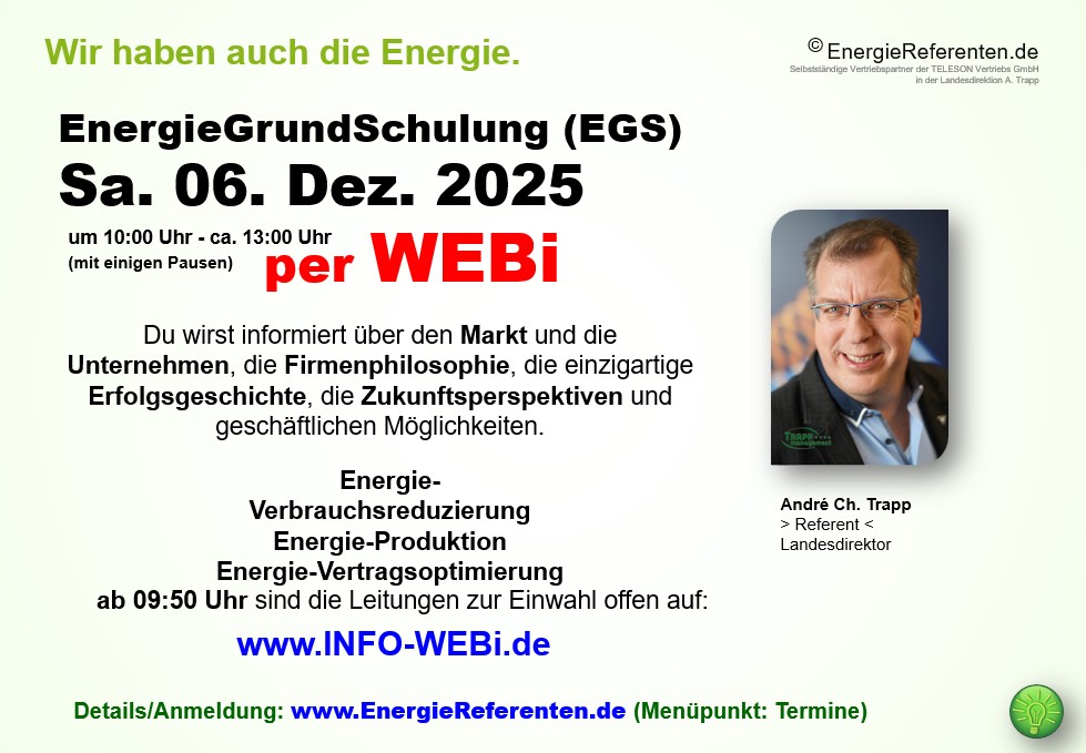 Teilnahmebedingungen: Du bist neue VP mit einer eigenen VP-Nr. in unserer Landesdirektion A. Trapp und optional bereits an einer EnergieGrundSchulung (EGS) teilgenommen.